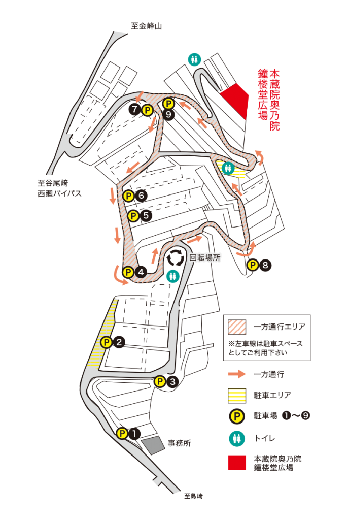 ※ お車でご来苑の方は警備員の誘導に従い、苑内の駐車場もしくは一方通行エリア(車道左側)を駐車スペースとしてご利用ください。