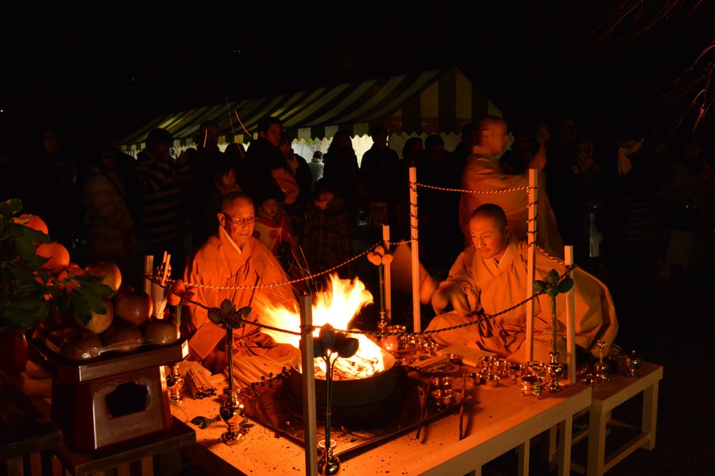 真言密教に伝わる秘法で護摩木と言われる木に願い事を記入し、導師により焚き上げられ、願主の願いを御本尊不動明王に届け、旧年中の厄災を払い、現世利益を願うものです。